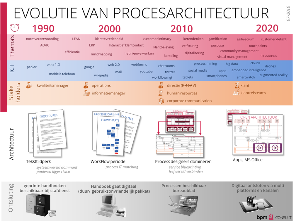 Het tijdperk waarbinnen procesmanagement is vormgegeven heeft zijn stempel gedrukt op de elementen die in beeld verschijnen. In grote lijnen zien we in procesarchitectuur een verschuiving van intern naar extern, van gesloten naar open, van tekst naar beeld, van functioneel naar belevingsgericht en van externe legitimatie naar intrinsieke kracht.