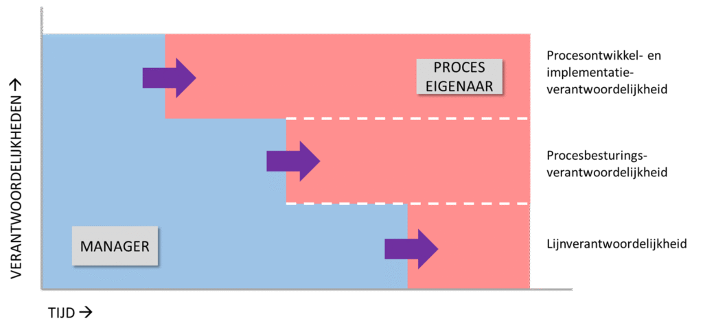 In het begin van de overdracht van proceseigenaarschap ligt de eindverantwoordelijkheid altijd nog bij de afdelingsmanager. Zodra de overstap is gemaakt naar procesgericht werken (processen zijn geïdentificeerd, ontworpen en geïmplementeerd), kan een eerste groep verantwoordelijkheden worden overgedragen. De verantwoordelijkheid voor het (door)ontwikkelen en implementeren van procesverbeteringen is daarbij de meest logische keuze, omdat de manager zich niet meer bezig hoeft te houden met de hele HOE-vraag (hoe werkt men, en hoe kan dat beter).