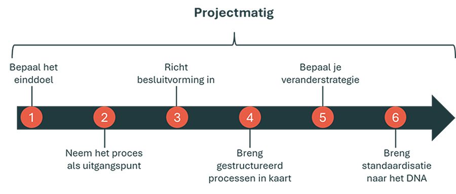 Standaardiseren vraagt om een gedisciplineerde aanpak waarin keuzes expliciet worden gemaakt en vastgehouden. Zonder heldere methodiek verzandt standaardisatie in discussies, herhaling en losse documentatie.