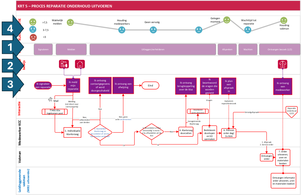 Het resultaat van het in kaart brengen van deze vier elementen is een toevoeging aan het ‘standaard’ functioneel stroomschema (swimlane), waardoor de klant een prominente plek krijgt in elk proces en elke activiteit in de organisatie kan worden gericht op optimalisatie van de klantbeleving.